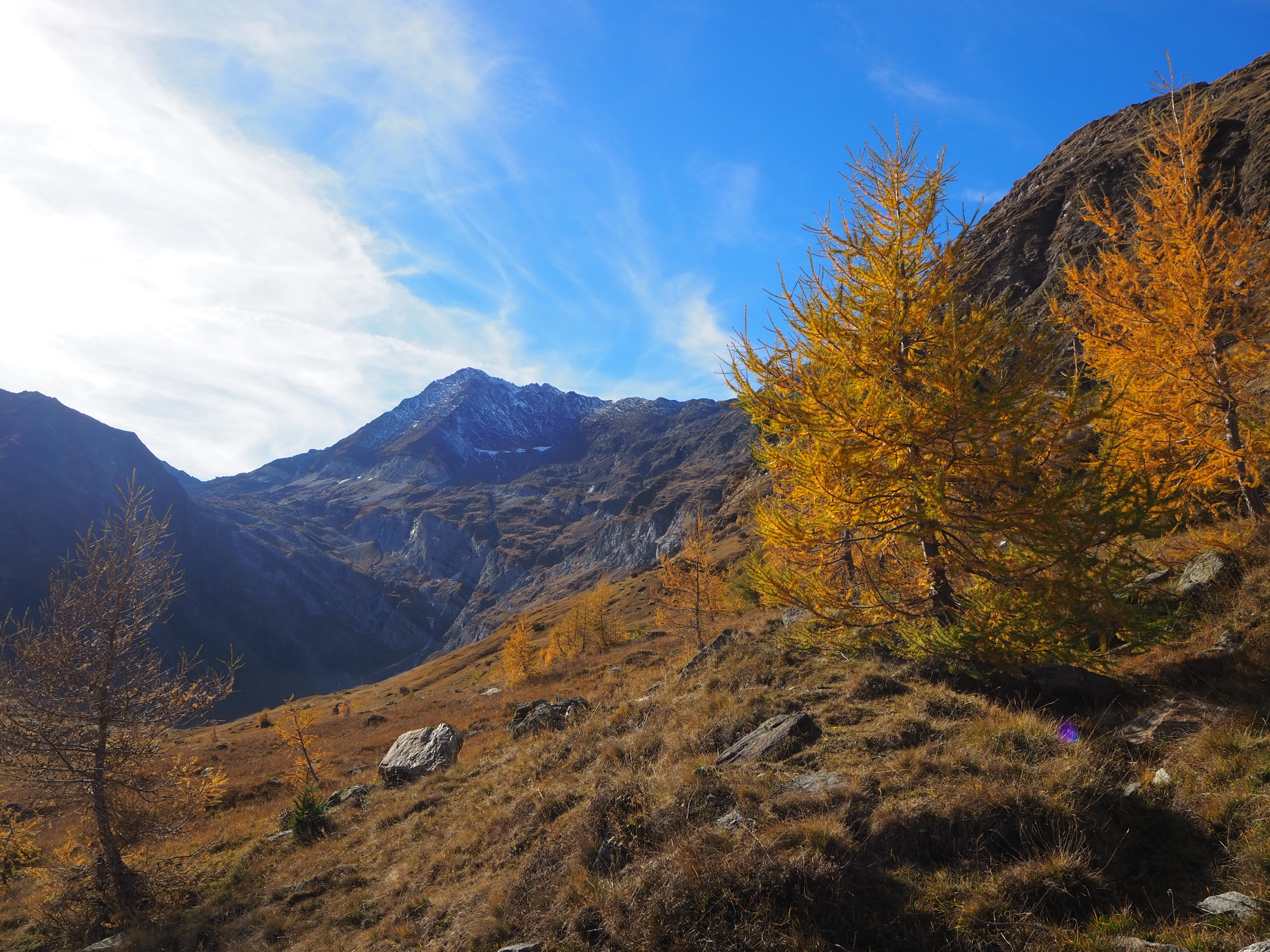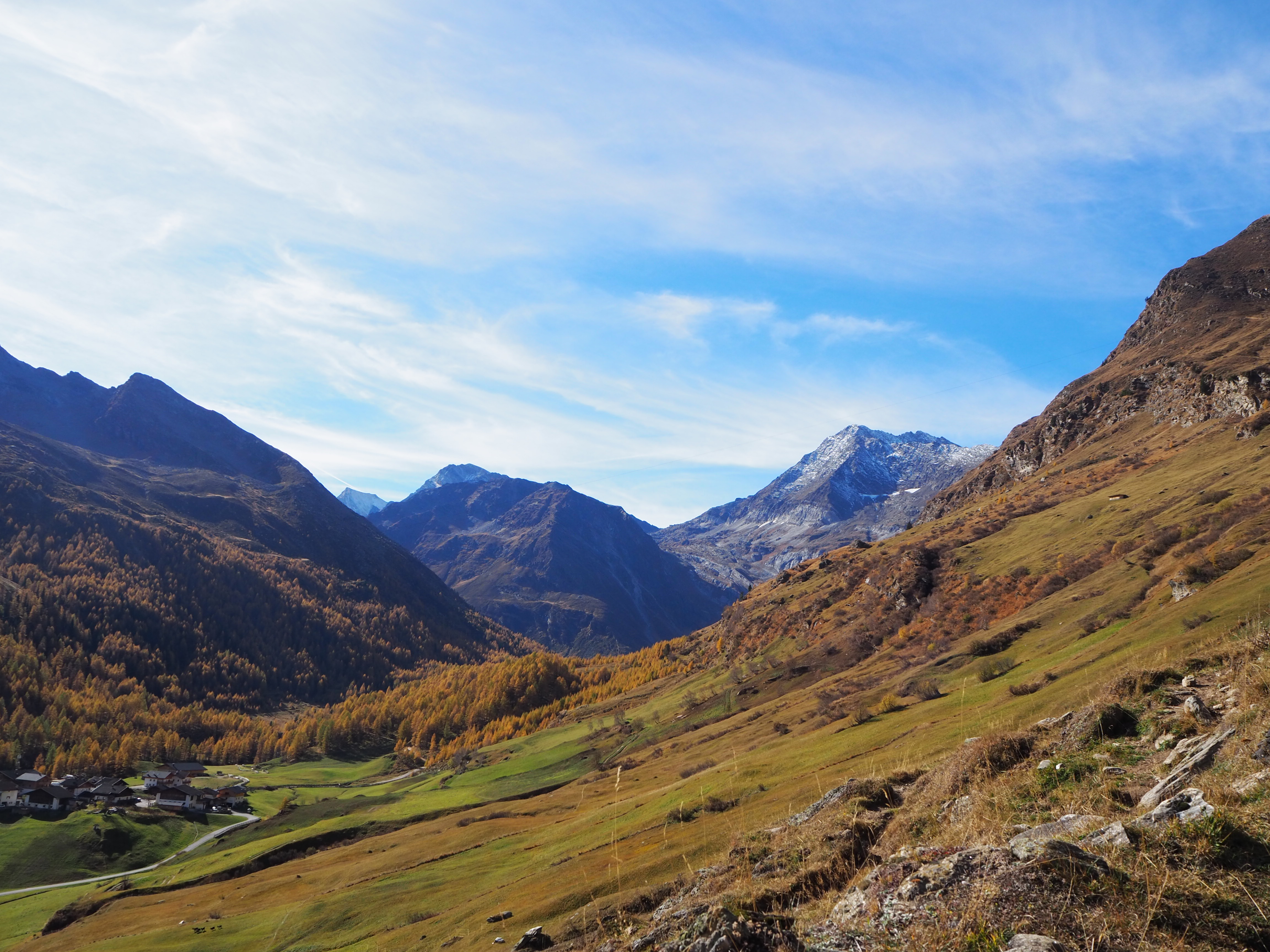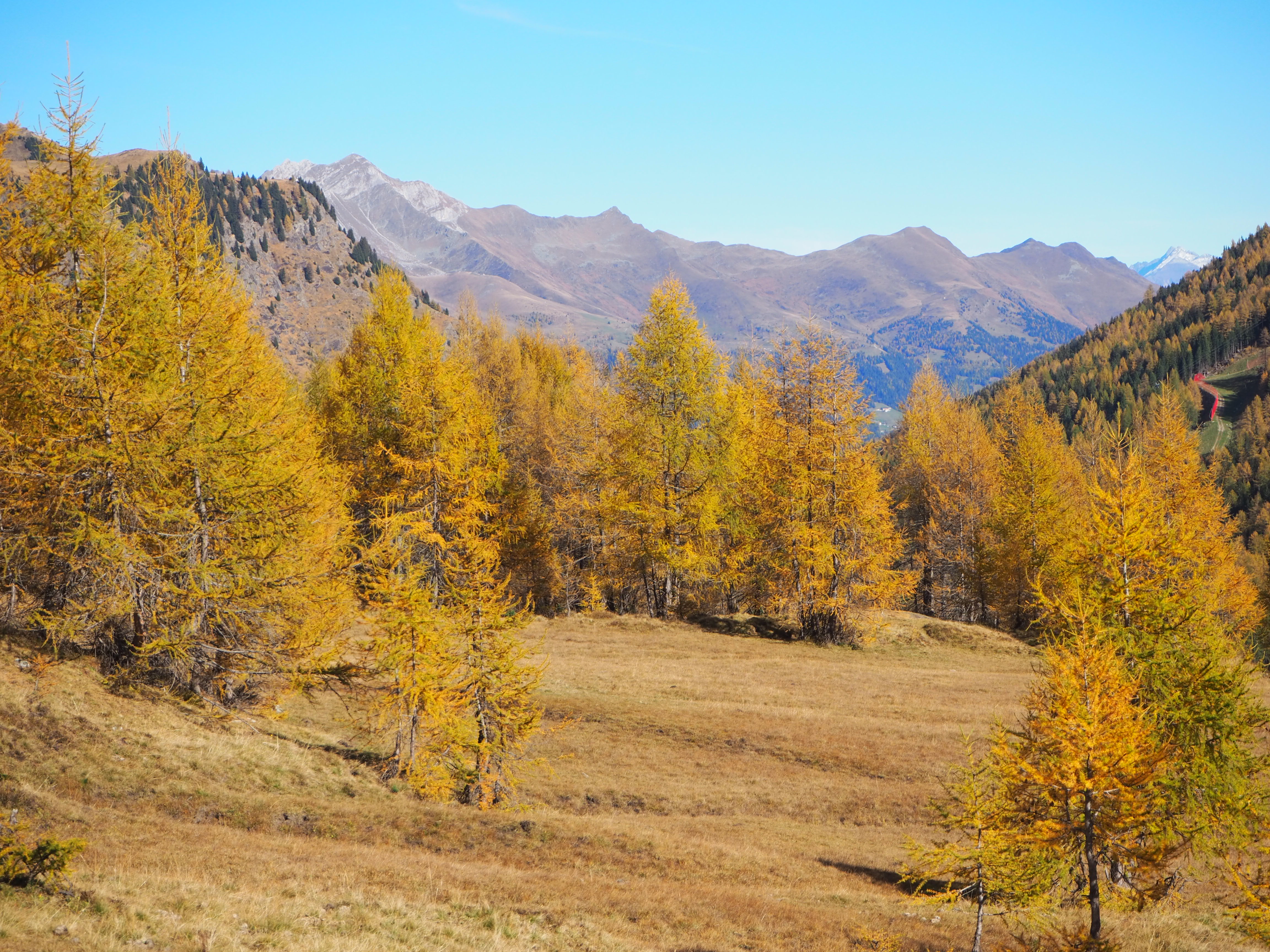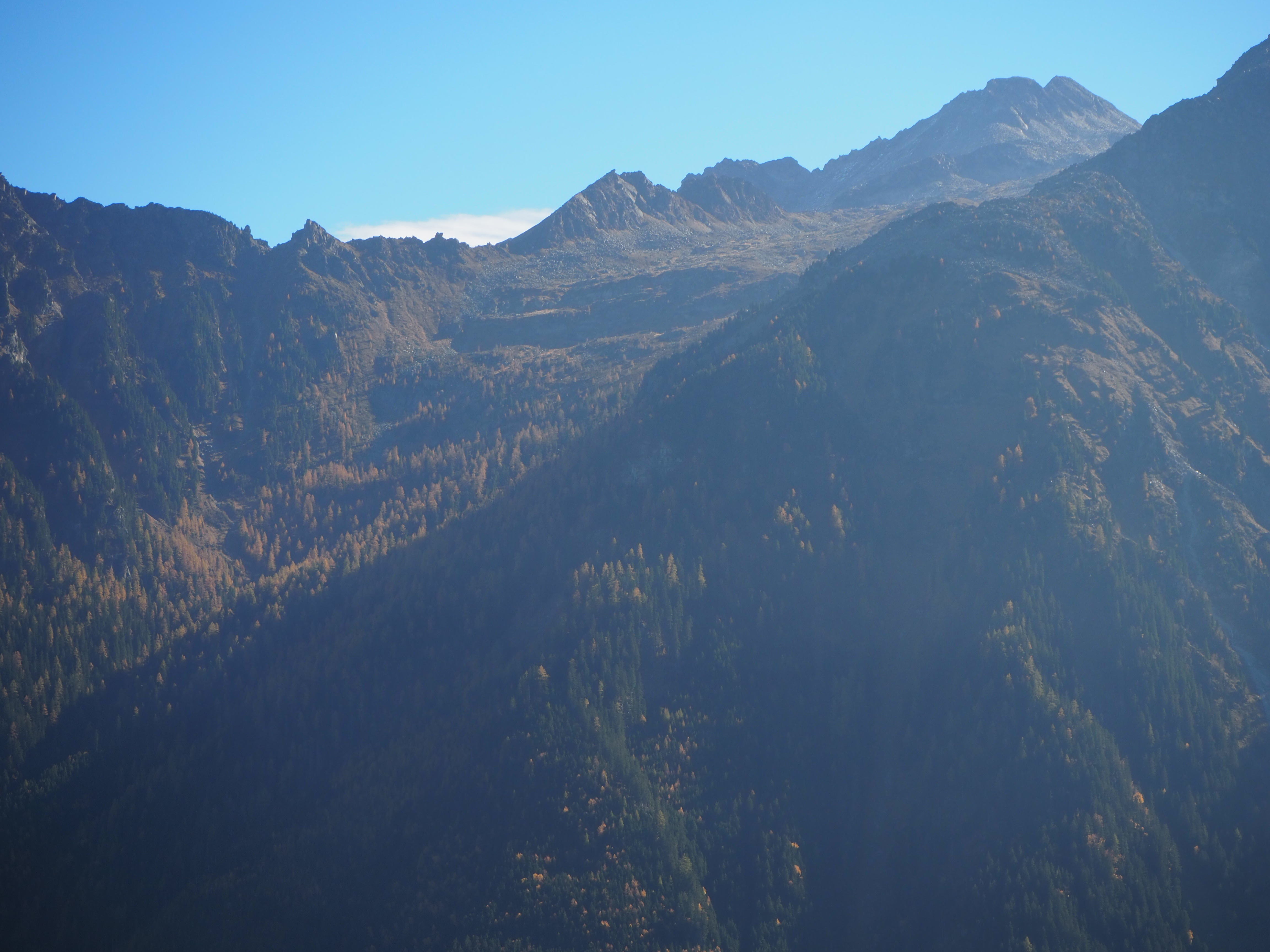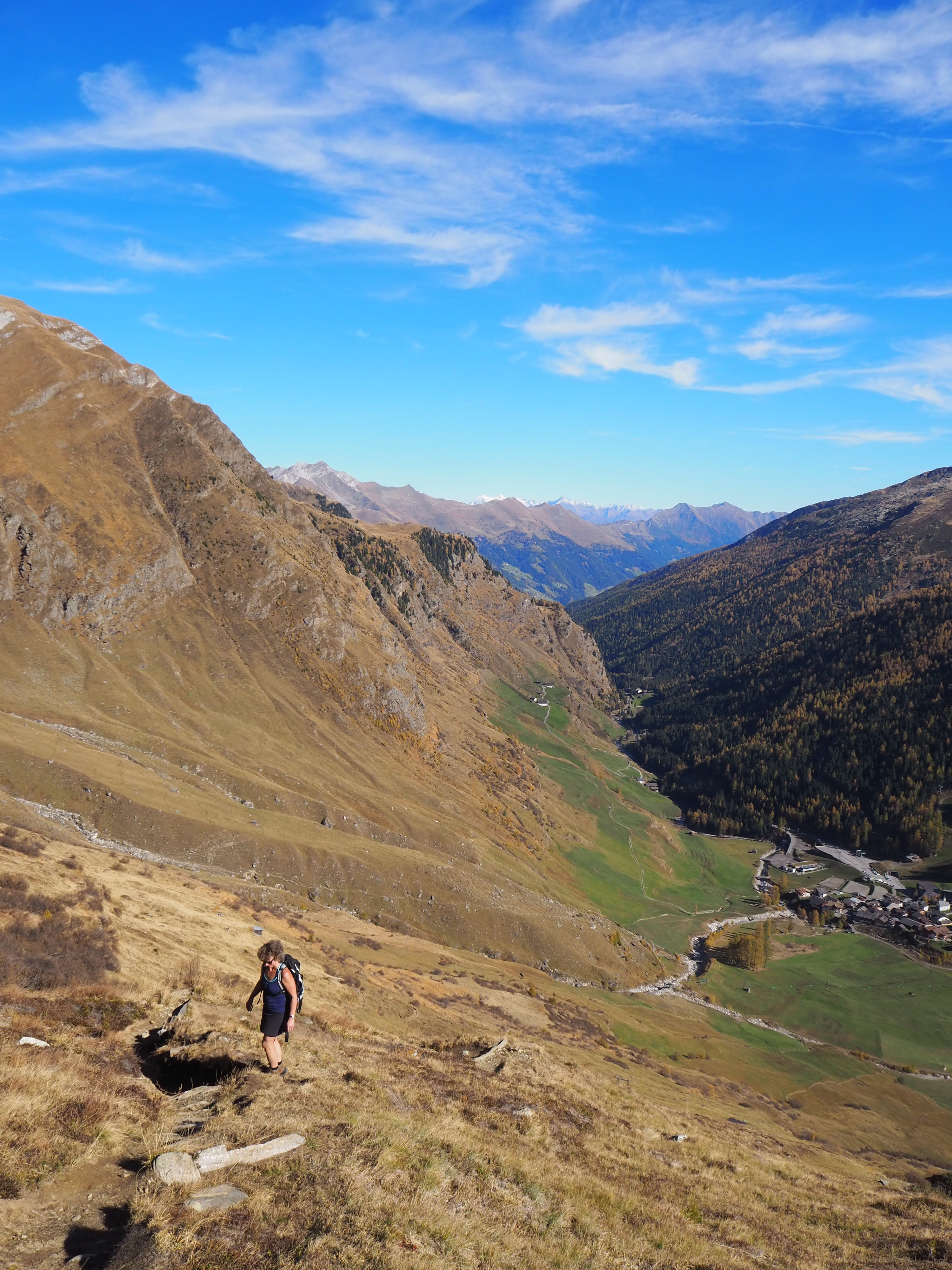 Wir gehen auf der Sonnenseite des Tales auf dem Weg 6a Richtung Schneidalm (2159 m) bis wir auf den Weg 44b stoßen (ca. 2100 m), dem wir bergabwärts folgen. Wir erreichen nach gut 2,5 Stunden Gehzeit den sehr schön gelegenen Lazinser Hof (1772 m). (Kaiserschmarren und Gulasch mit Knödeln, beides sehr lecker). Wir erreichen den Bus um 16.34 in Pfelders und sind schließlich um kurz nach 17 Uhr wieder in St. Leonhard.