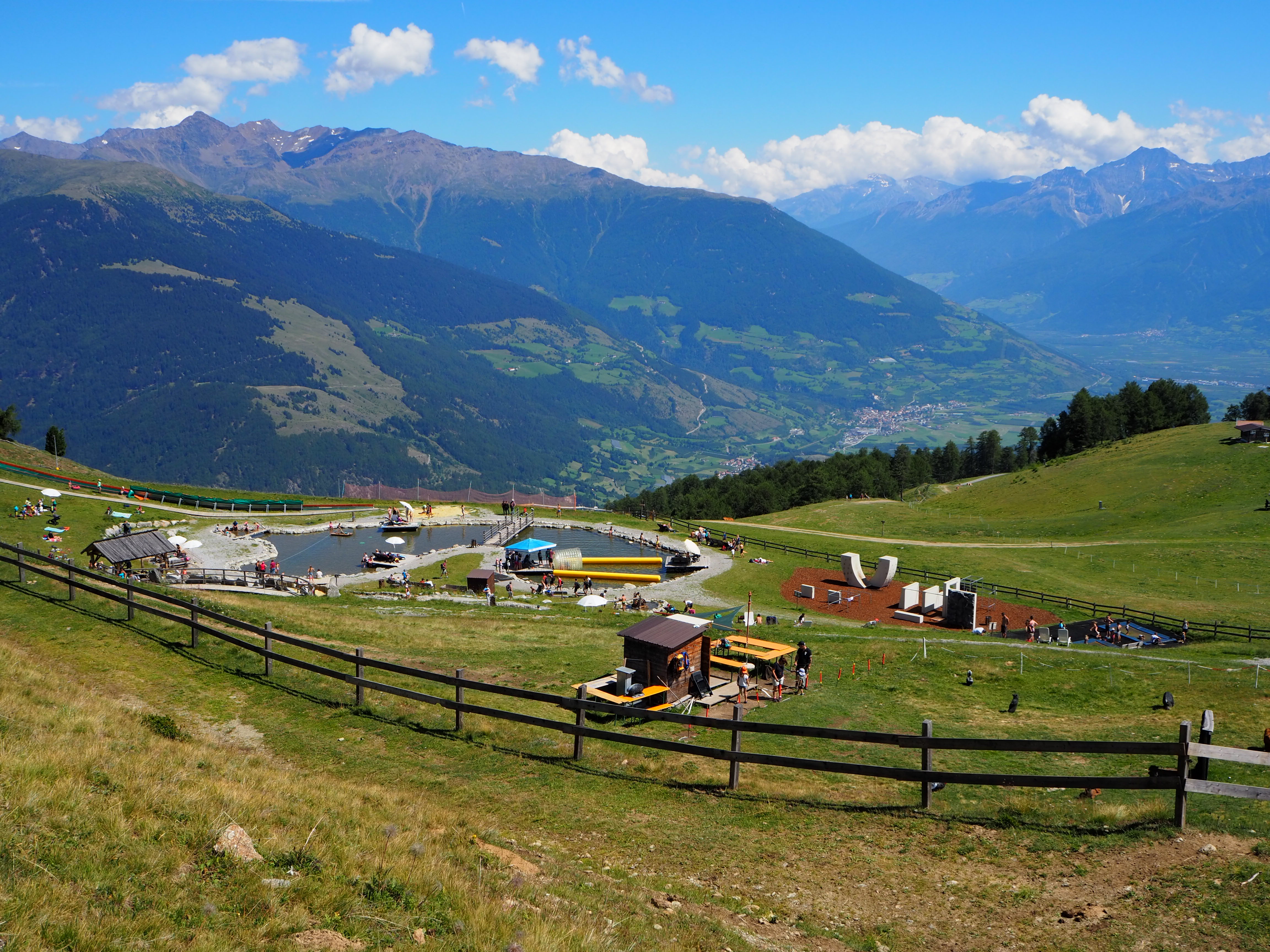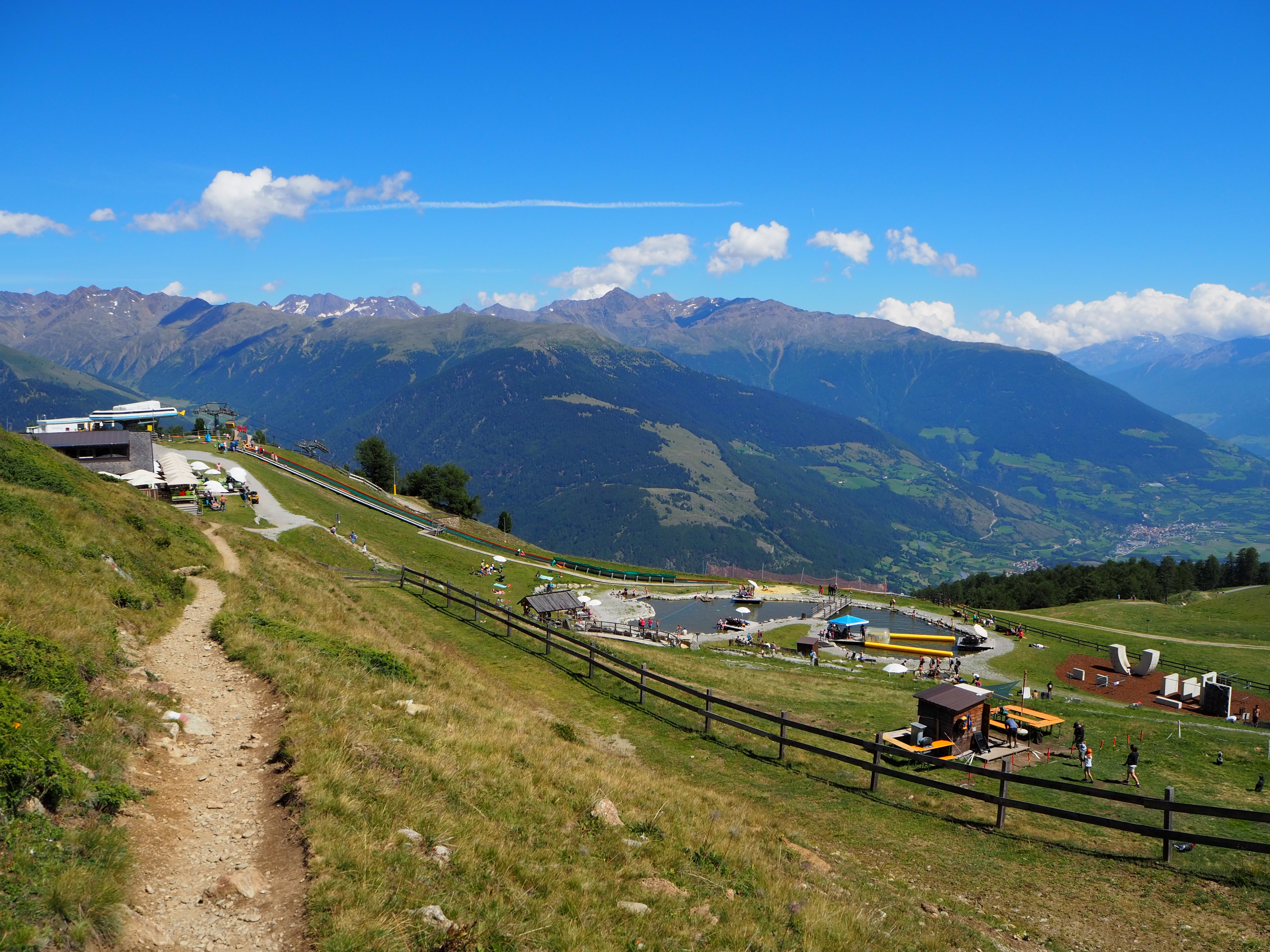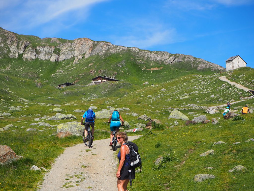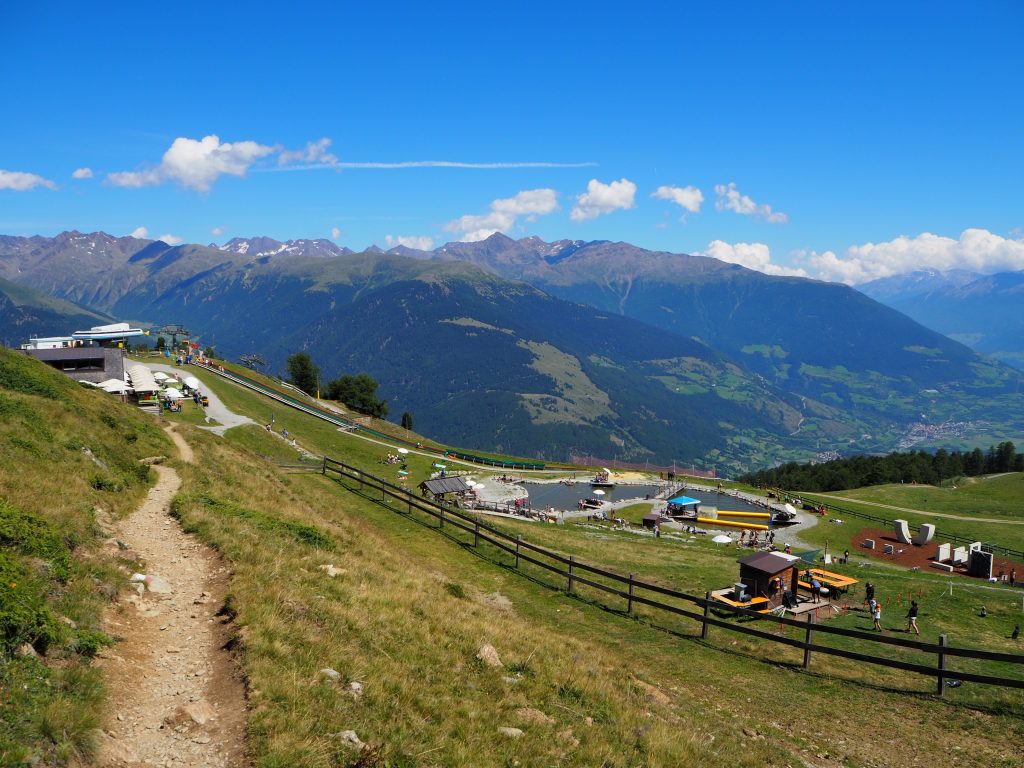 Bei bestem Wetter über die Schlinig-Alm zur Sesvenna-Hütte, von dort zur Bergstation des Sesselliftes Watles (Höhenweg, sehr schön!).
