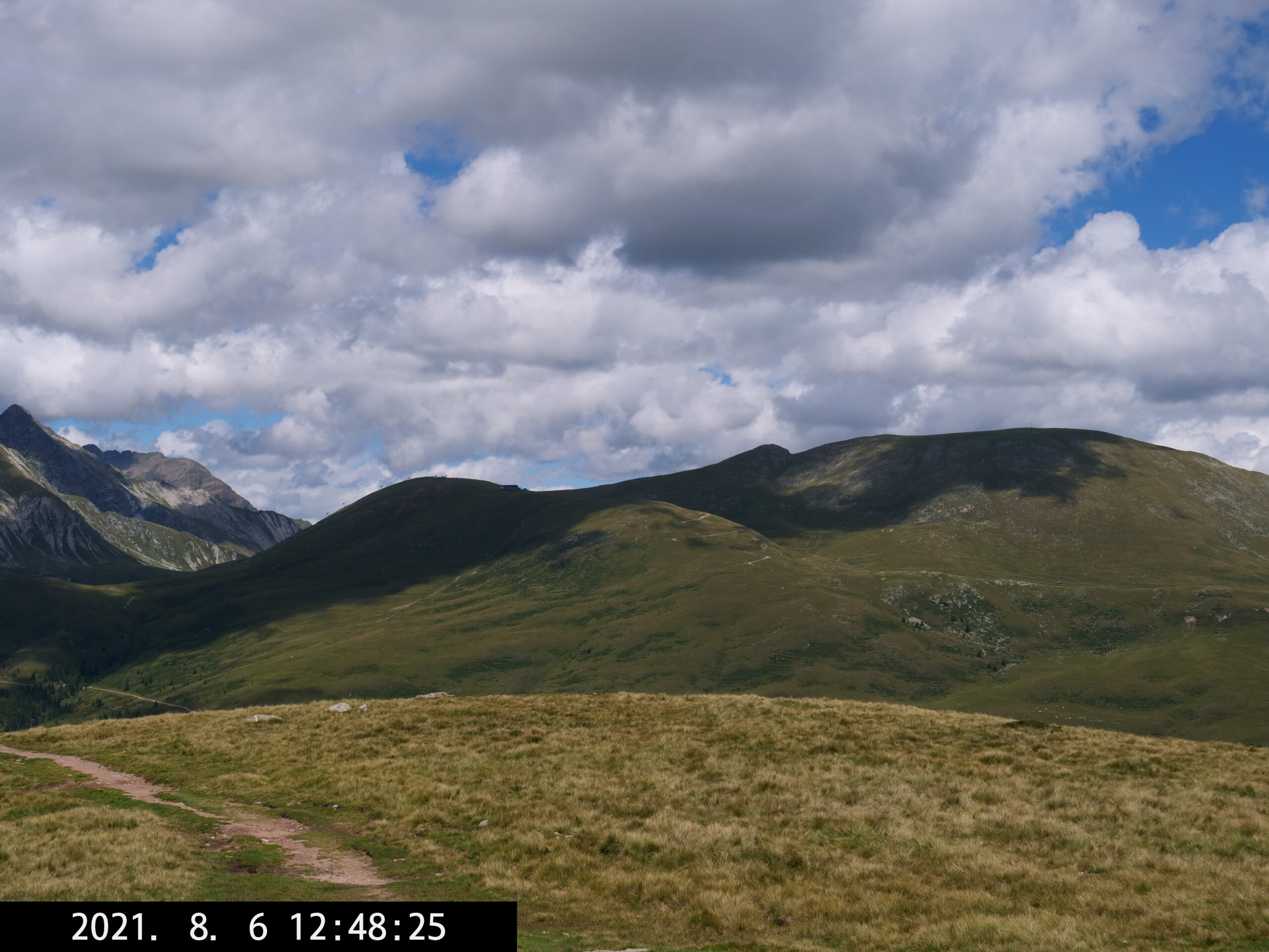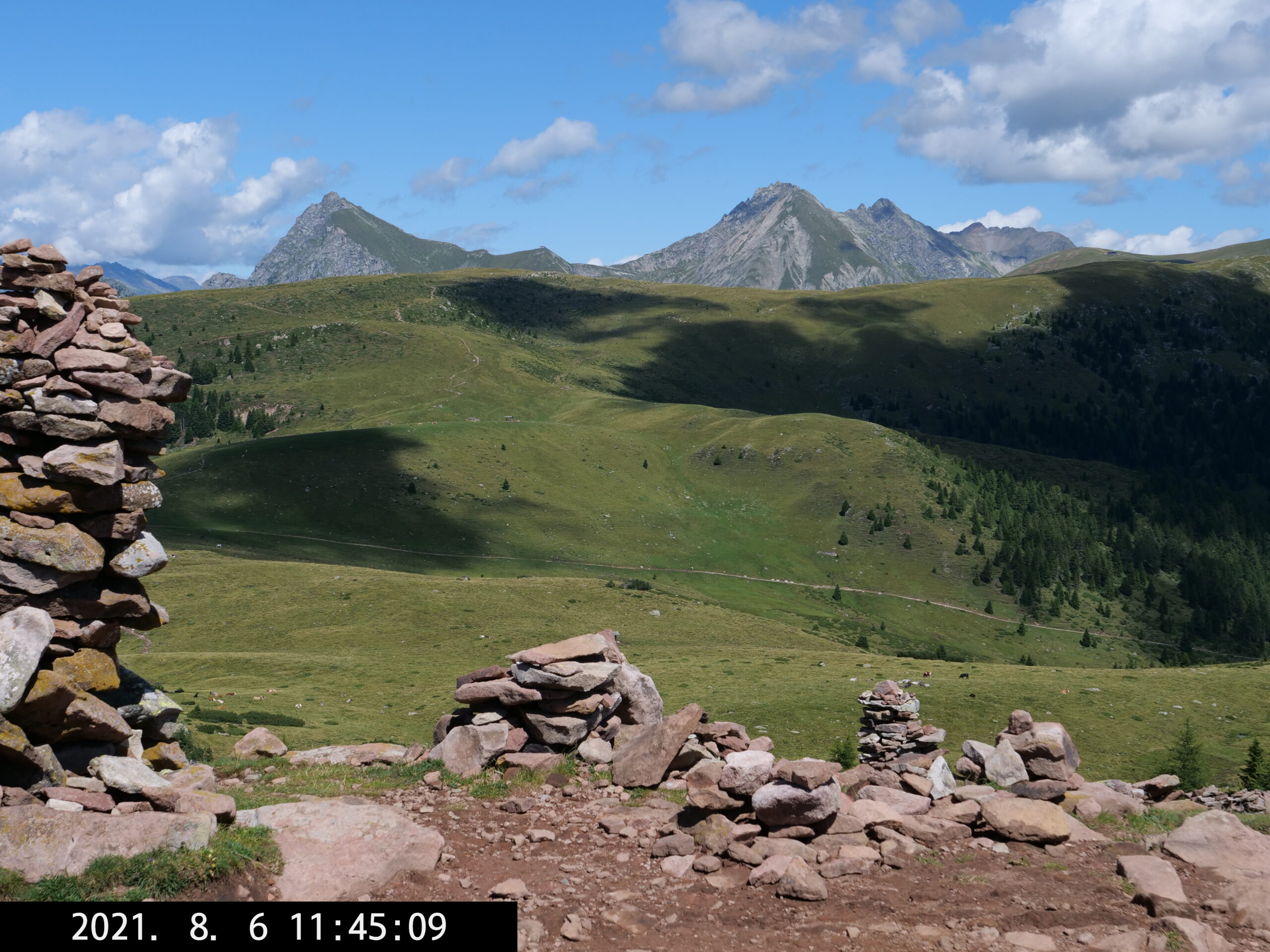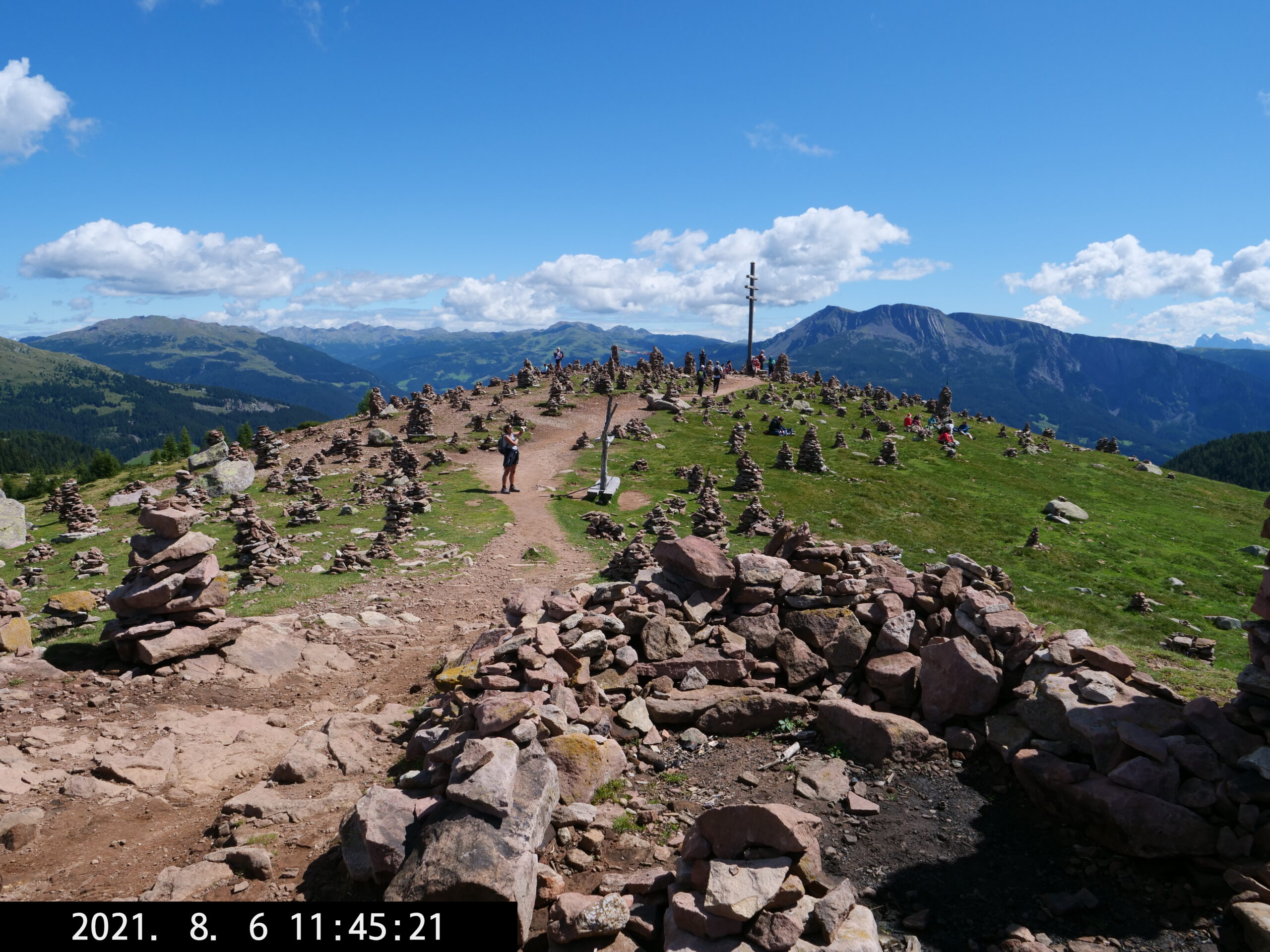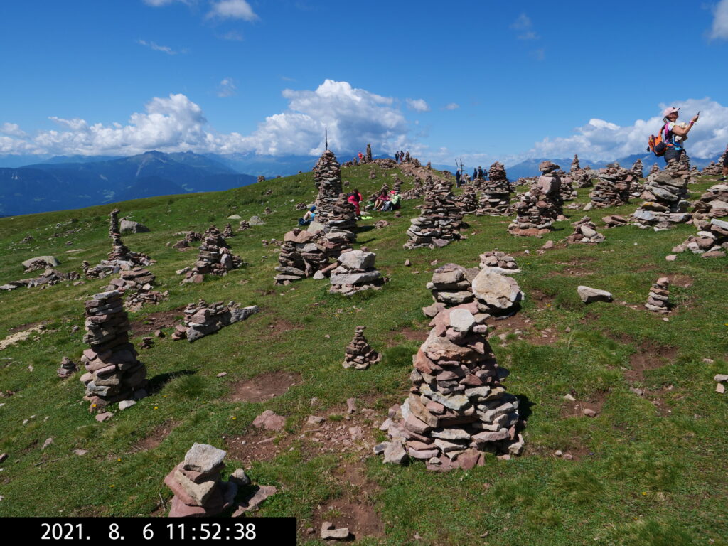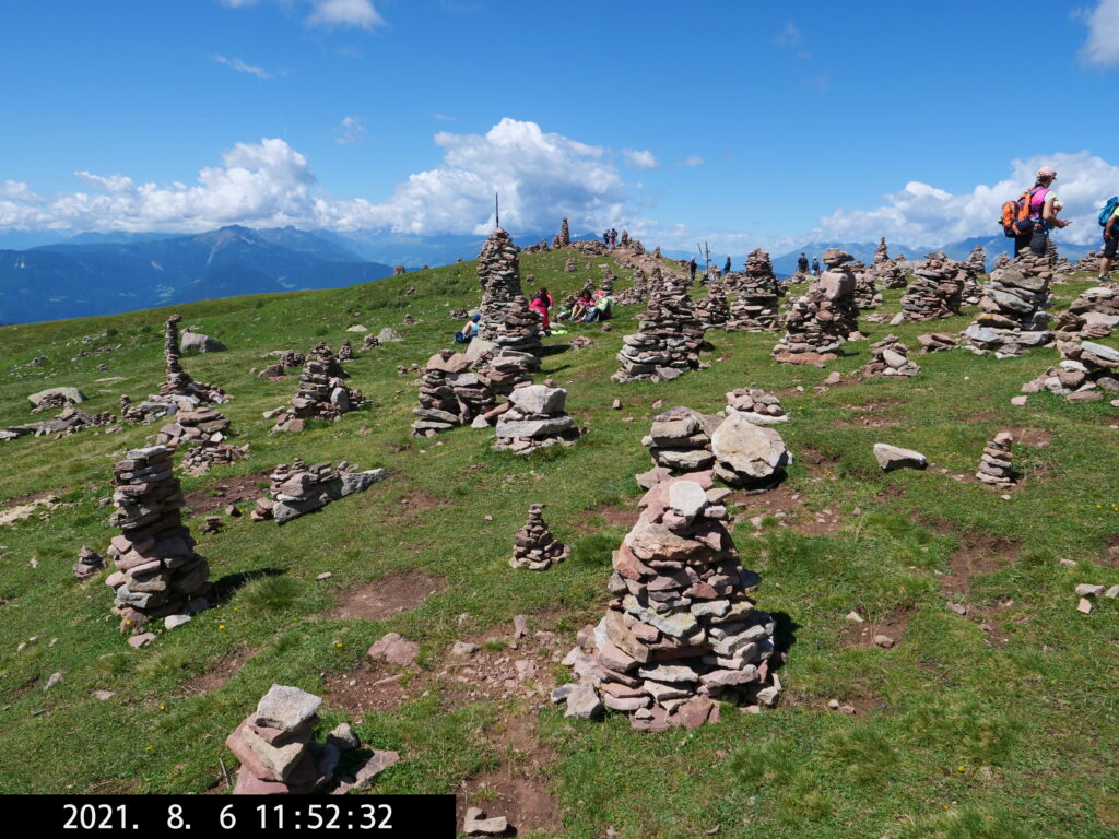 Die längste Wanderung führt uns vom Parkplatz Schermoos (Wanderbus) zu den Stoanerne Mandln (2003 m), dann über das Auenjoch, Kreuzjoch, vorbei an der Meraner Hütte nach Meran 2000 – bis dahin beste Wanderung – wir nehmen die Seilbahn nach Falzeben, gehen nach Hafling und nehmen dort den Bus nach Mölten, wo wir um 19 Uhr eintreffen. Dann sind es noch 2 Stunden bis zum Camping, ziemlich anstrengend, queren eine Wiese mit Stier – etwas unheimlich – und wir erreichen das WoMo kurz vor richtiger Dunkelheit um 21 Uhr. (Am Ende fast 42.000 Schritte.)