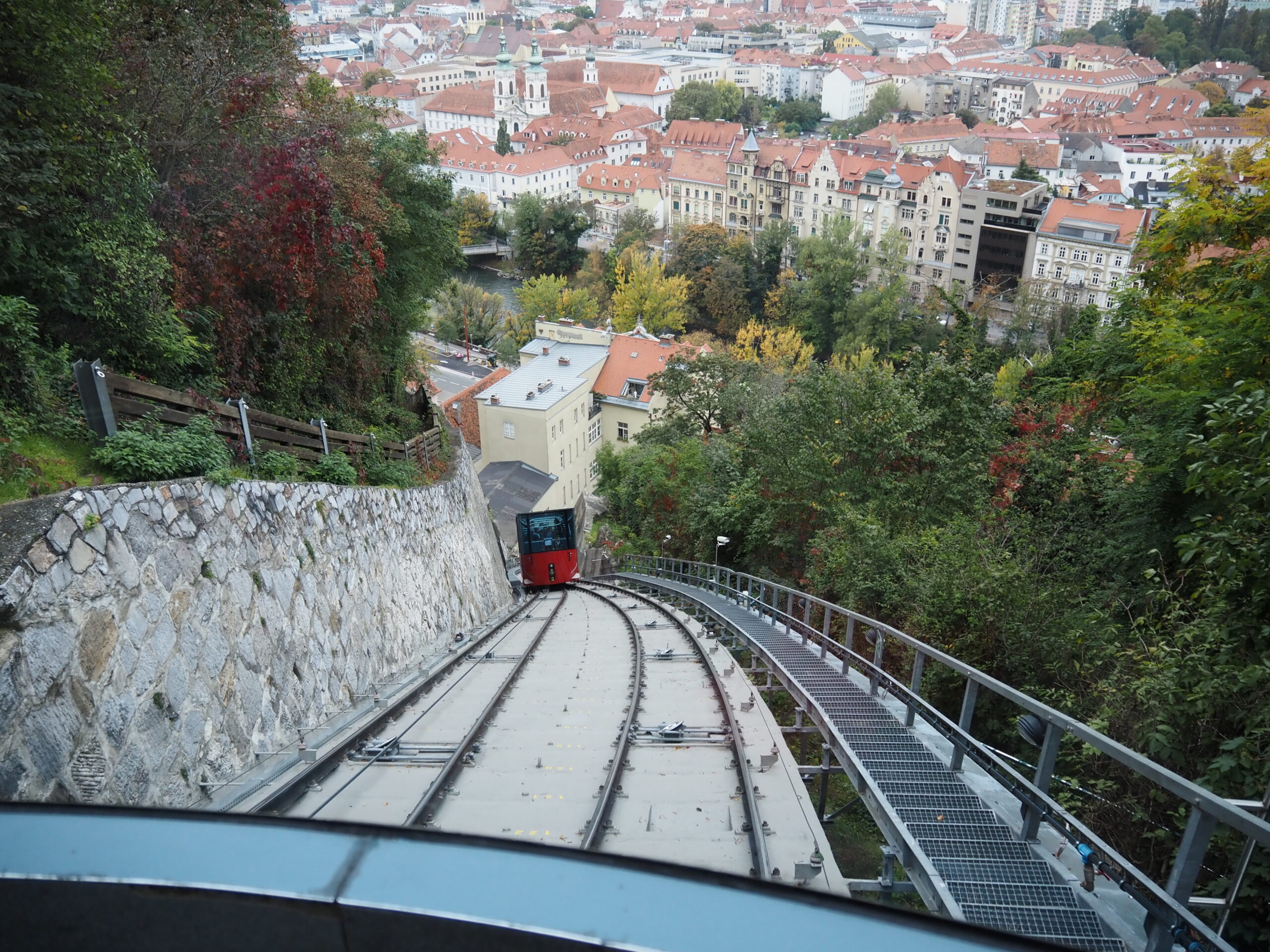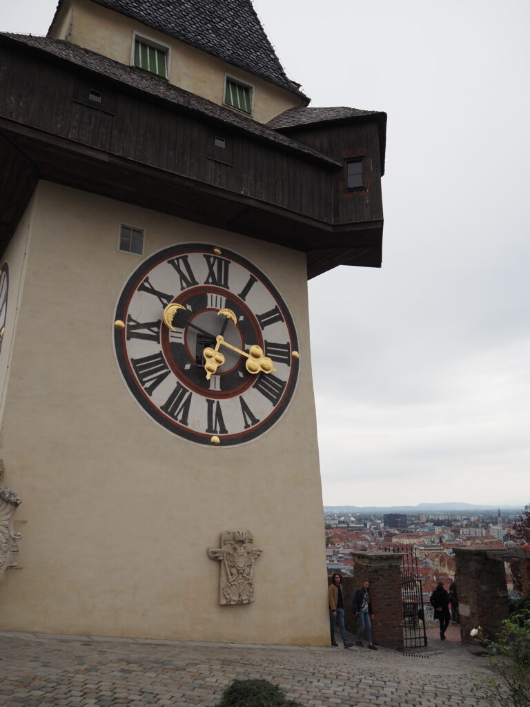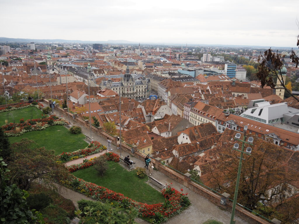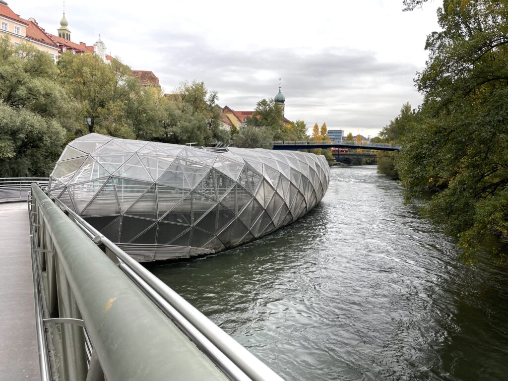 Wir fahren am Sonntag nachmittags in die Stadt, der Marathon ist quasi vorbei, wir bummeln durch die Altstadt, gehen auf den Schloßberg, überqueren die Mur bei Nutzung der Brücke über die – künstlich angelegte – Murinsel. Die Grazer Innenstadt gehört auch zum Weltkulturerbe, ist teilweise autofrei, jedoch führen Straßenbahnlinien und fahren Busse durch die Innenstadt und eben auch die Fußgängerzone.