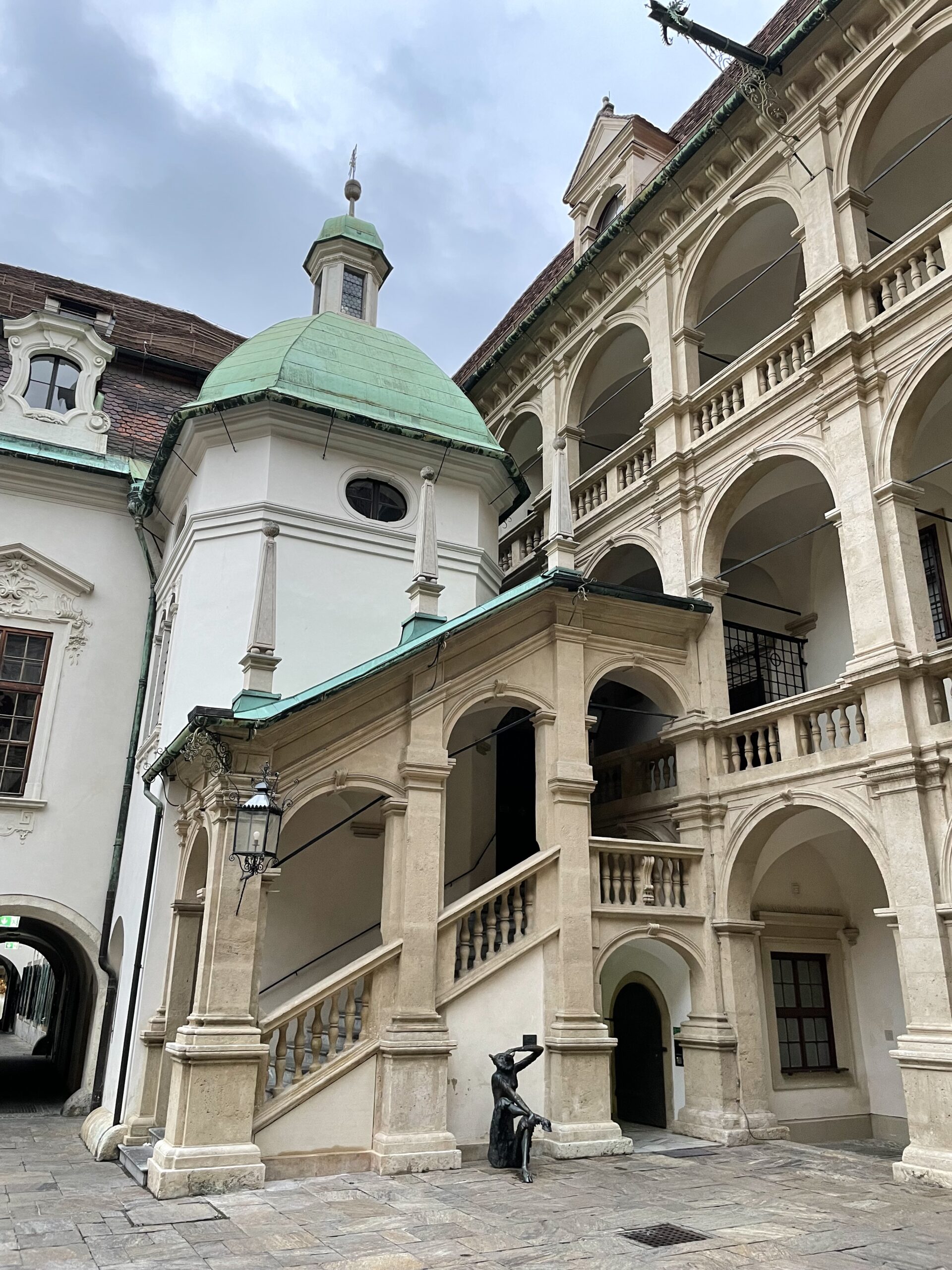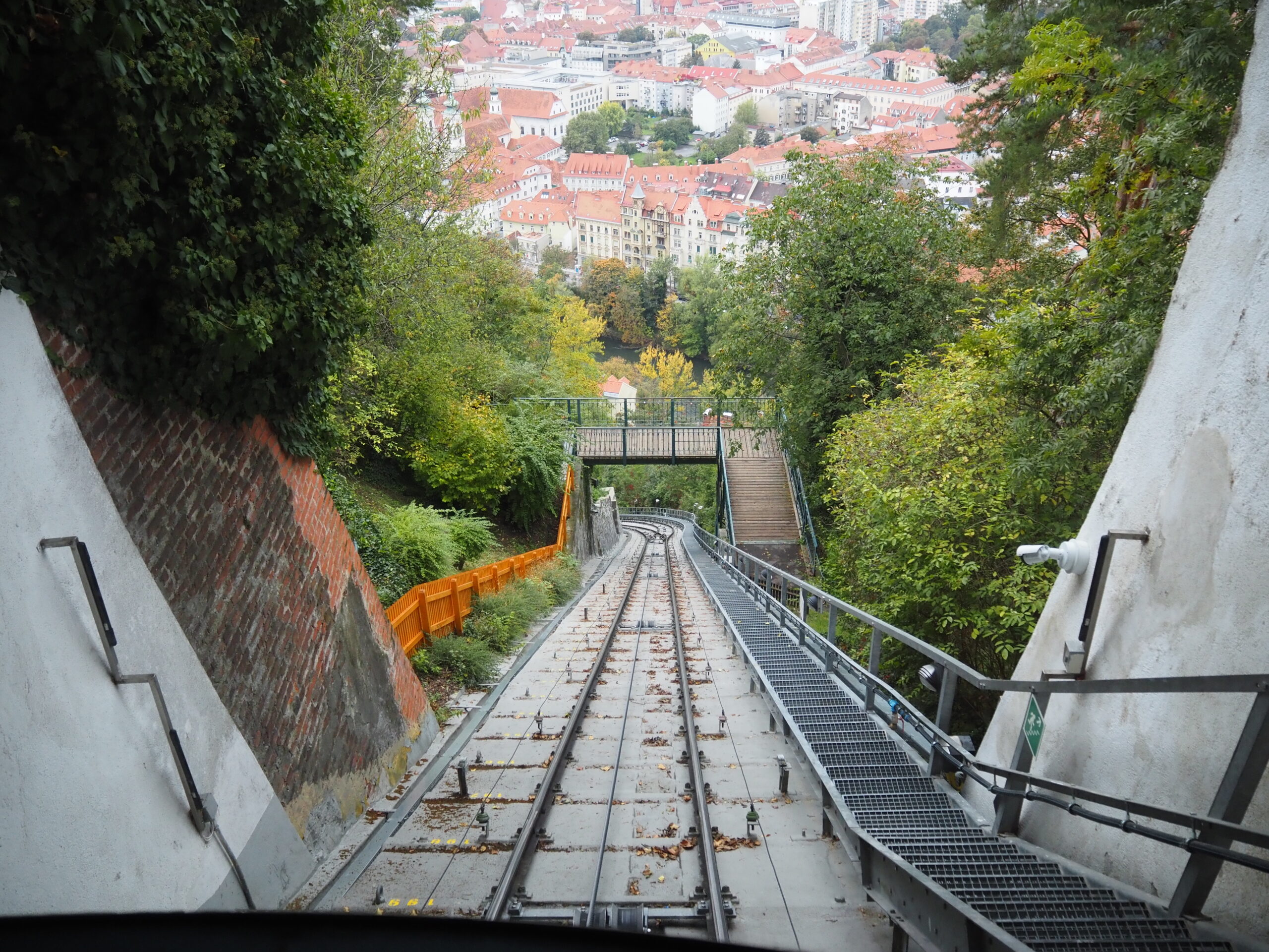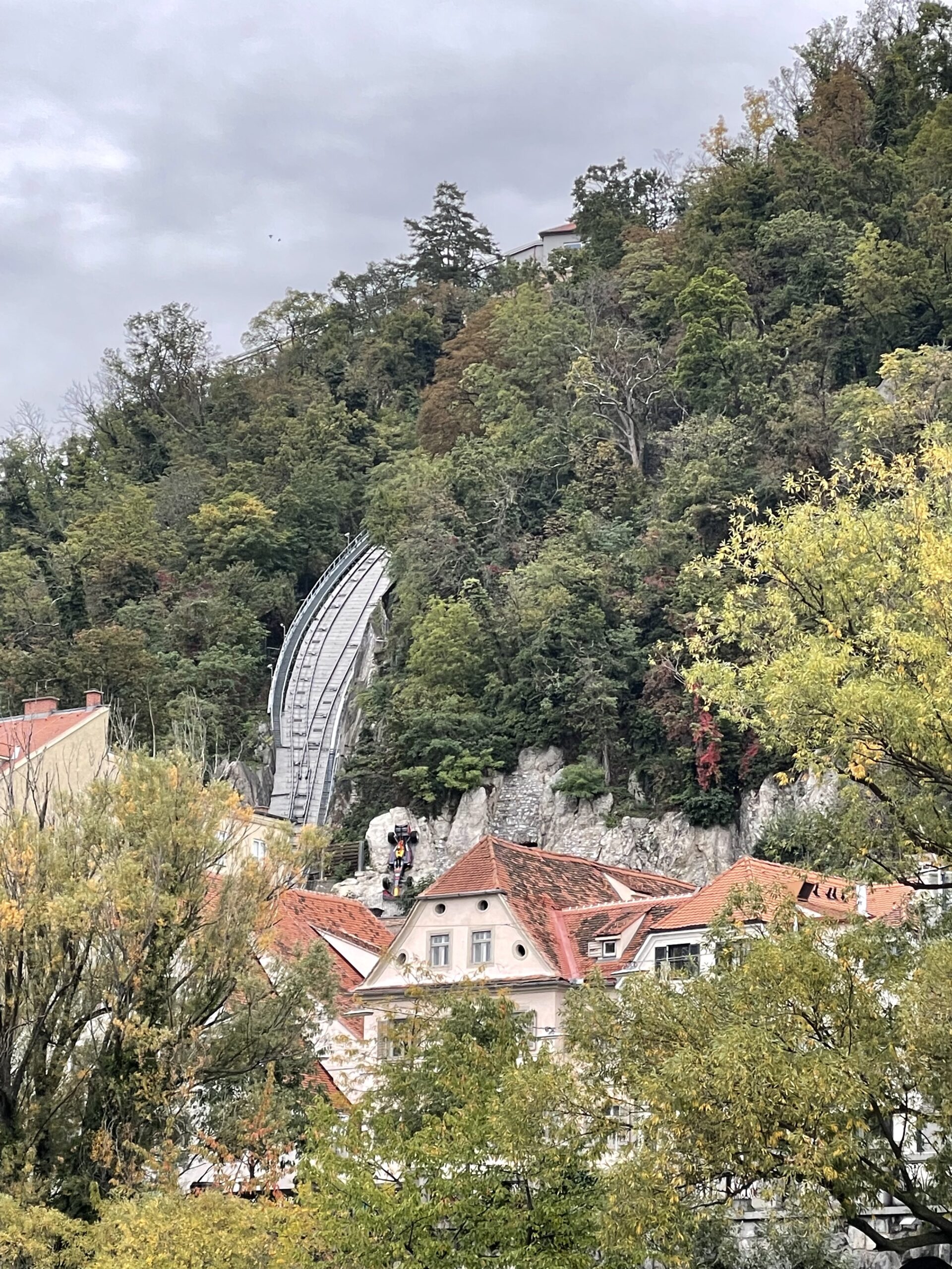 Wir fahren am Sonntag nachmittags in die Stadt, der Marathon ist quasi vorbei, wir bummeln durch die Altstadt, gehen auf den Schloßberg, überqueren die Mur bei Nutzung der Brücke über die – künstlich angelegte – Murinsel. Die Grazer Innenstadt gehört auch zum Weltkulturerbe, ist teilweise autofrei, jedoch führen Straßenbahnlinien und fahren Busse durch die Innenstadt und eben auch die Fußgängerzone.