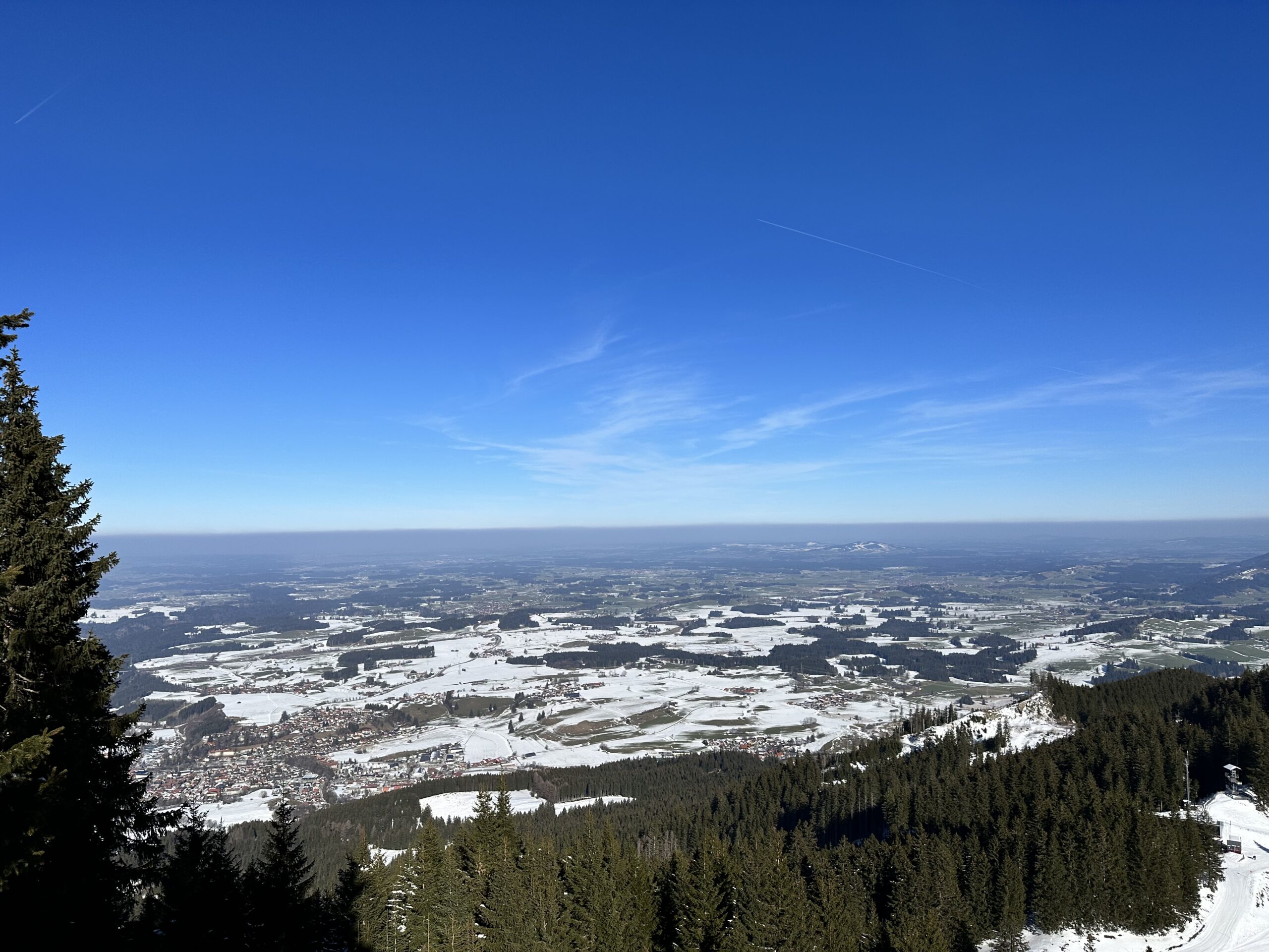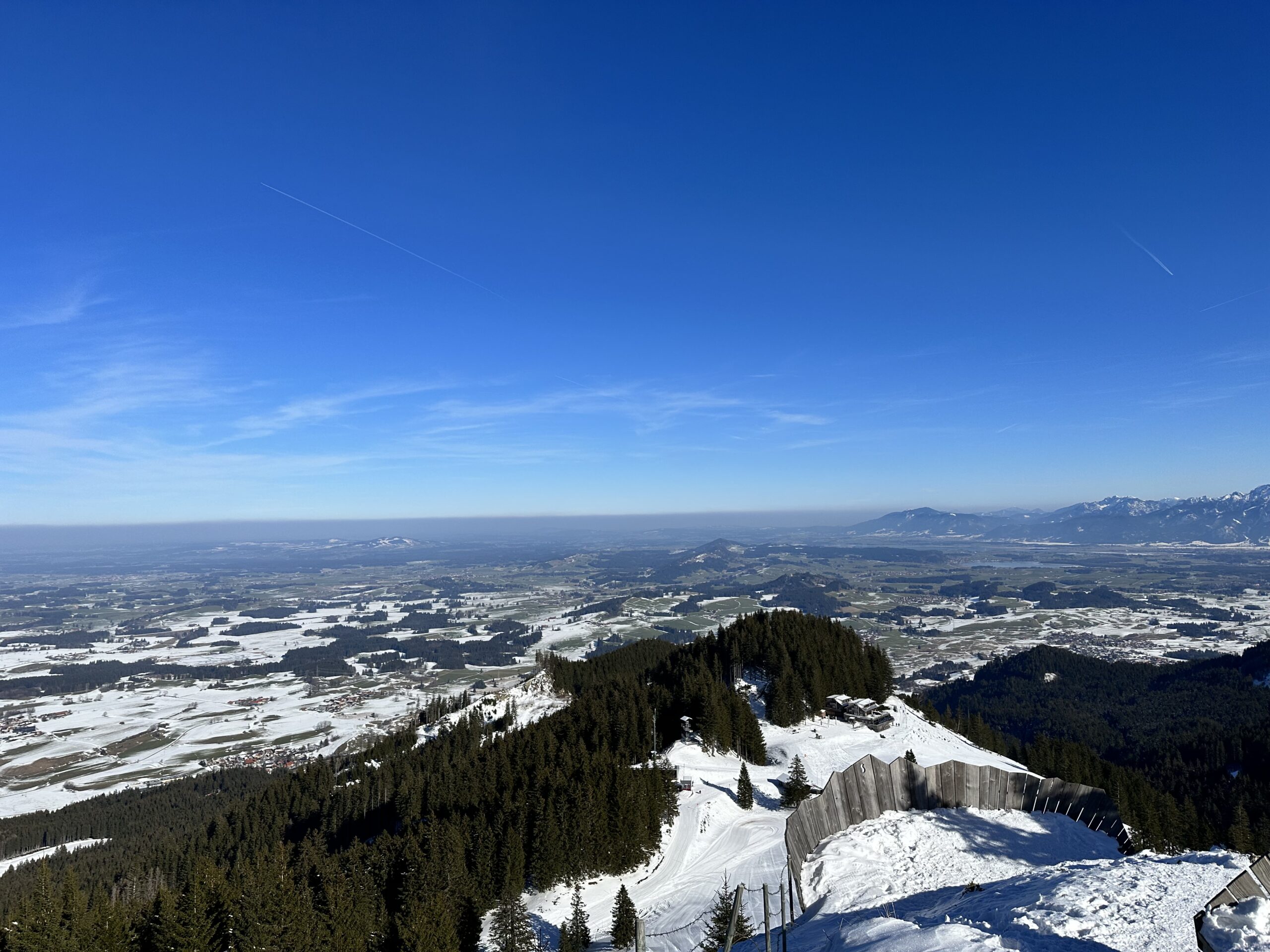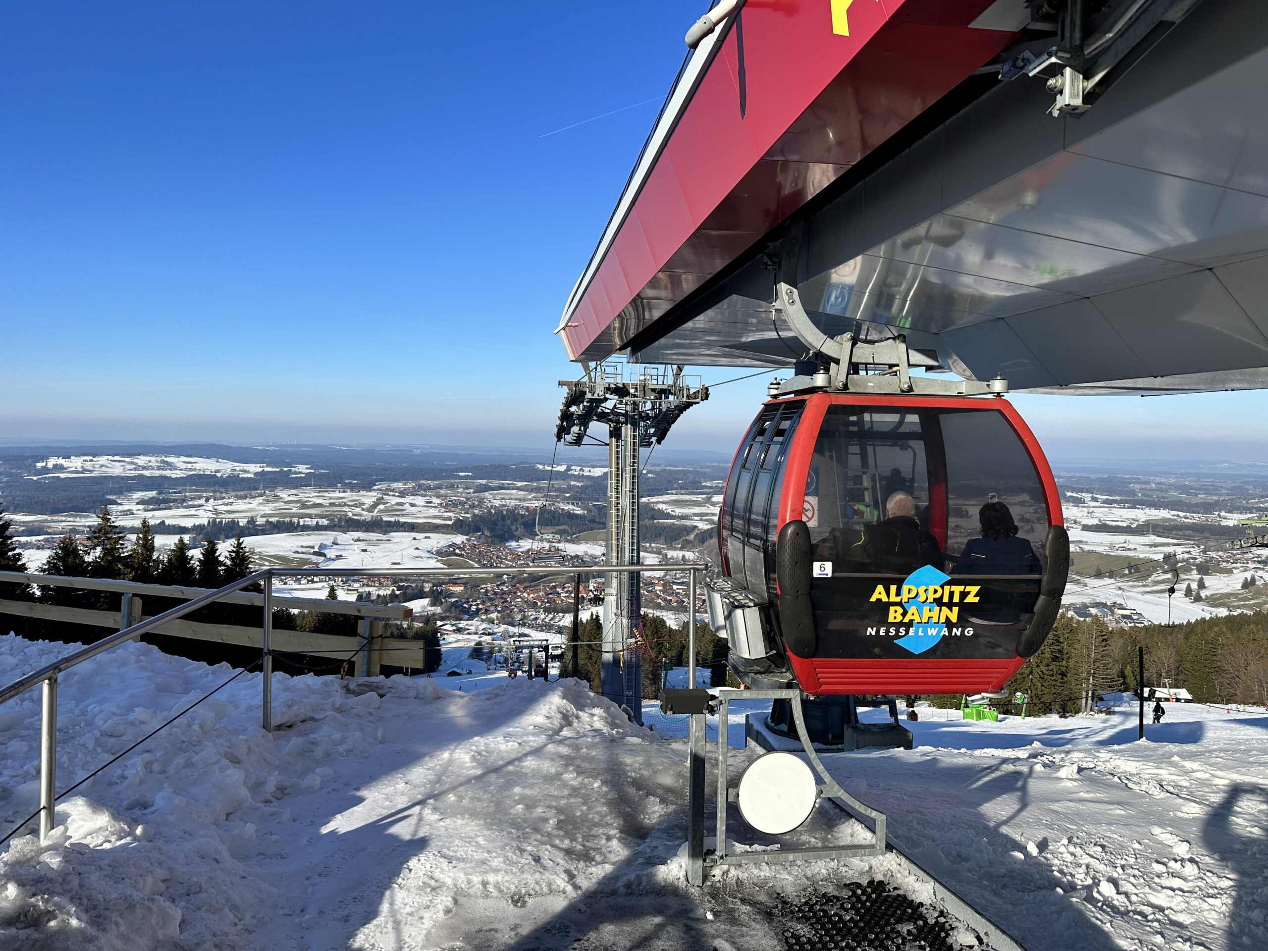 Freitag, 10.2., fahre ich mit der Alpspitzbahn ganz hoch (gut 20 €) und wandere dann sehr schön von der Bergstation zur Alpspitze und zurück – mit tollem Ausblick auf das Allgäu.