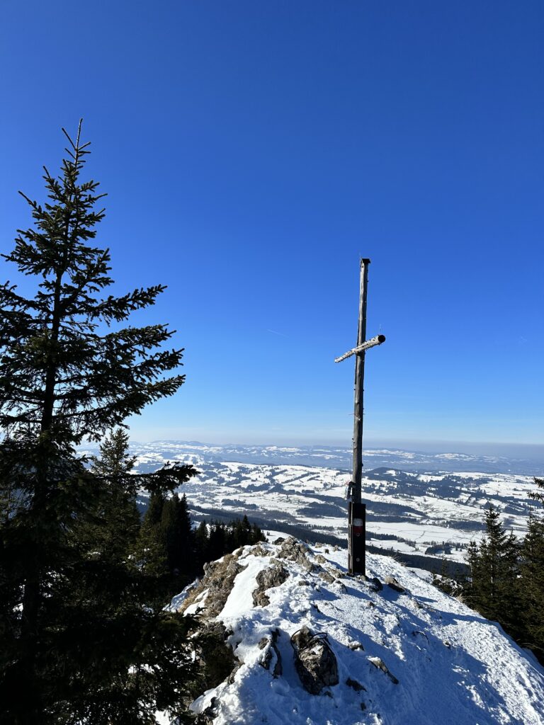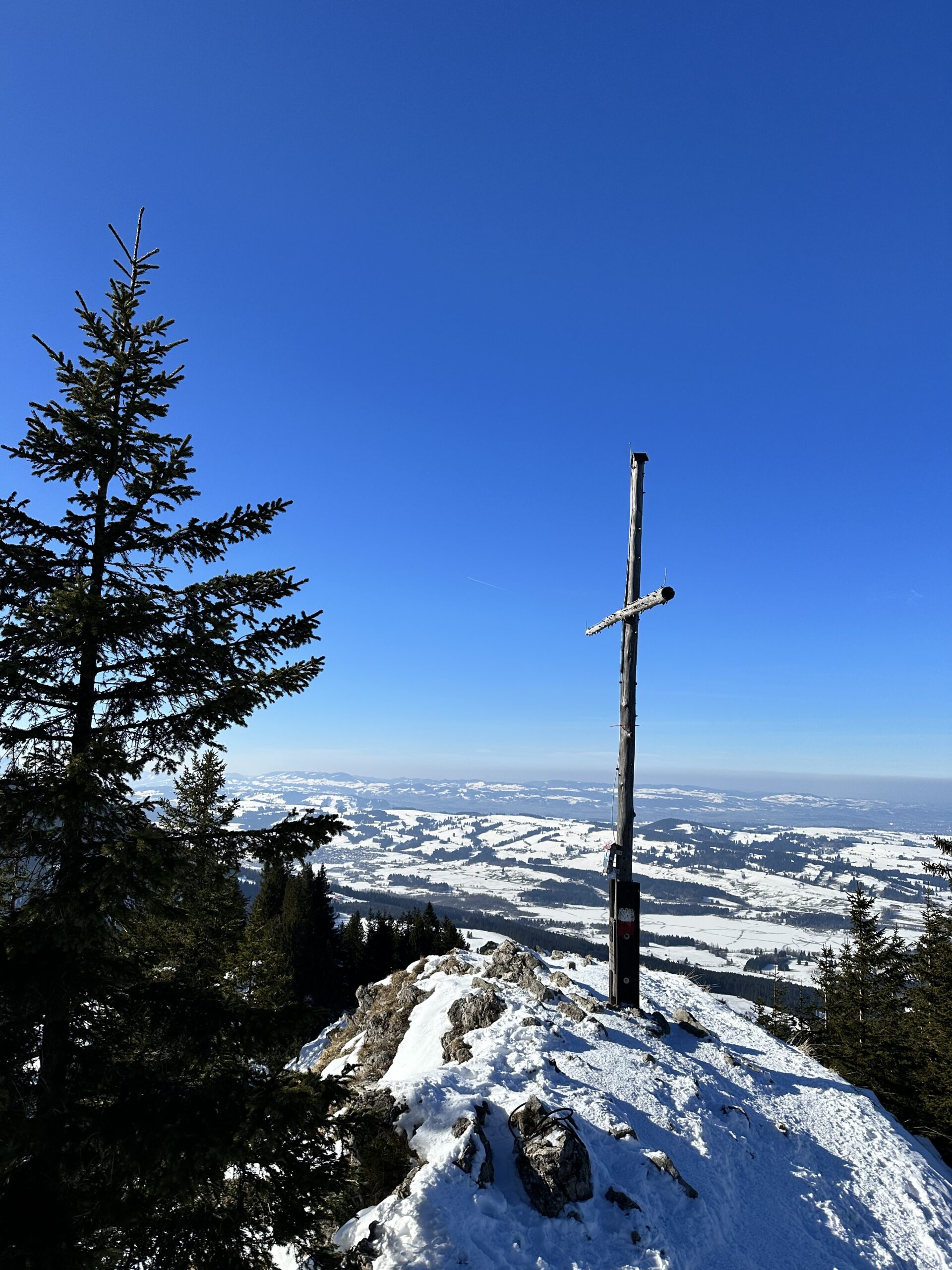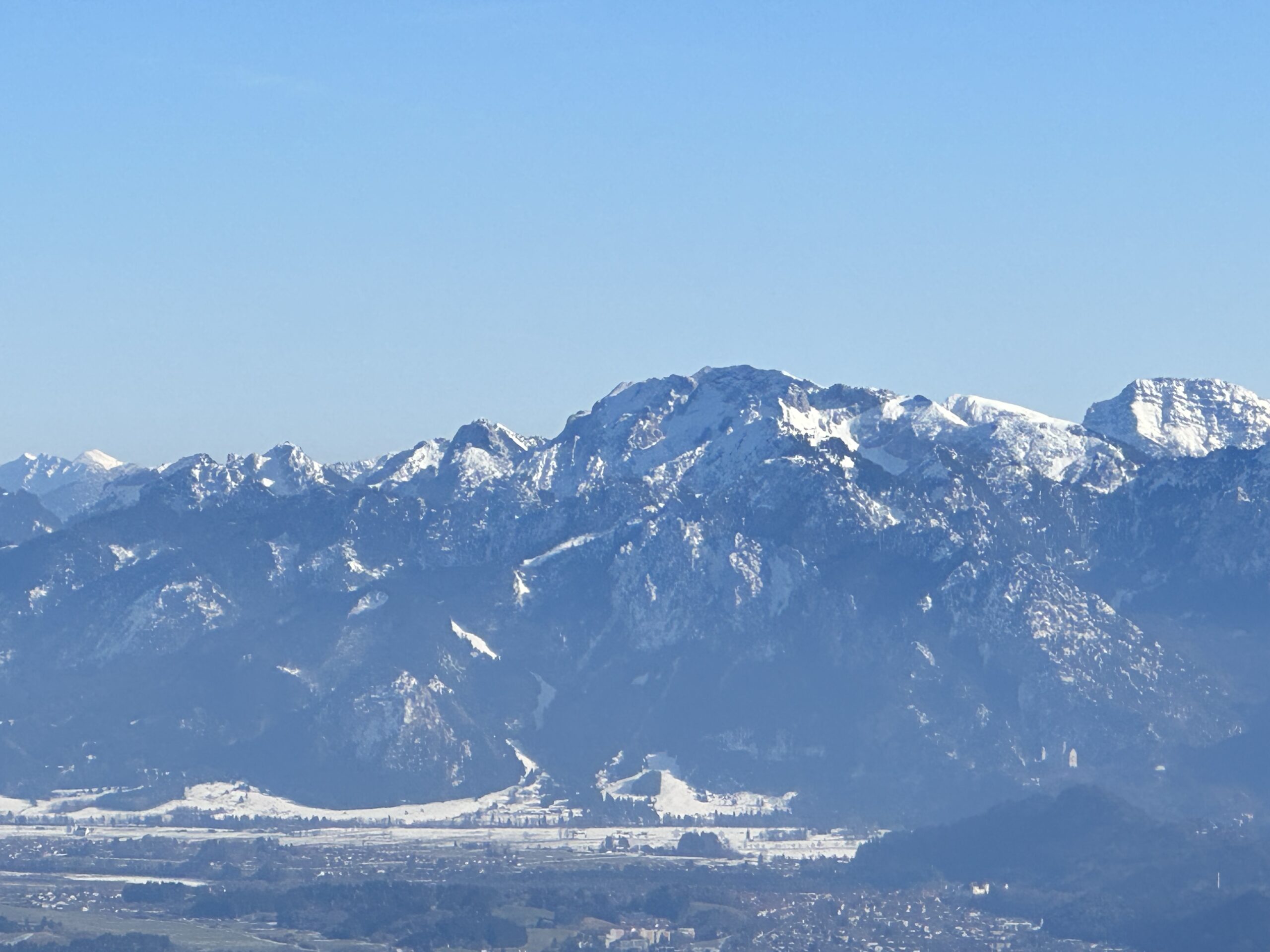Freitag, 10.2., fahre ich mit der Alpspitzbahn ganz hoch (gut 20 €) und wandere dann sehr schön von der Bergstation zur Alpspitze und zurück – mit tollem Ausblick auf das Allgäu.