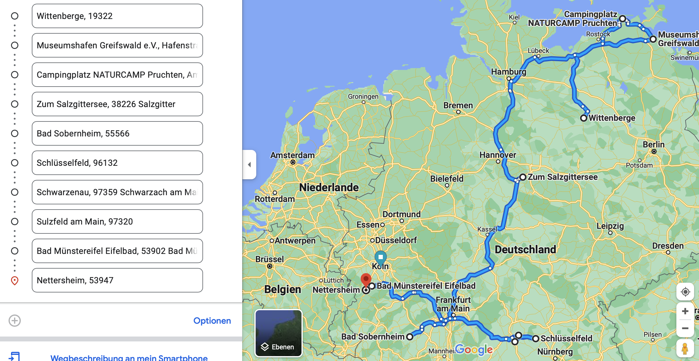 Ca. 2800 km, die erste und die letzte Station (Eitorf) fehlen, ferner der Stellplatz in Aachen.