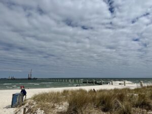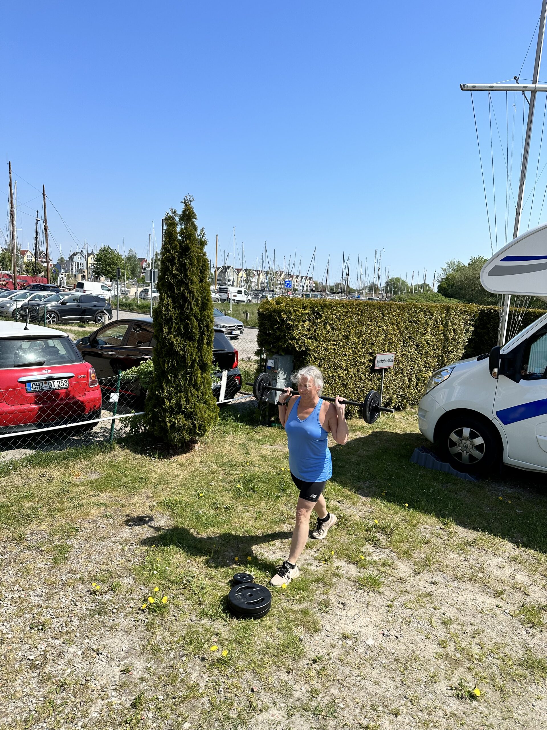 Ich fahre mit dem Rad rund um den Bodden, ca. 120 km, was mir dann auch reicht, zumal der Akku vom Rad leer ist am Ende.