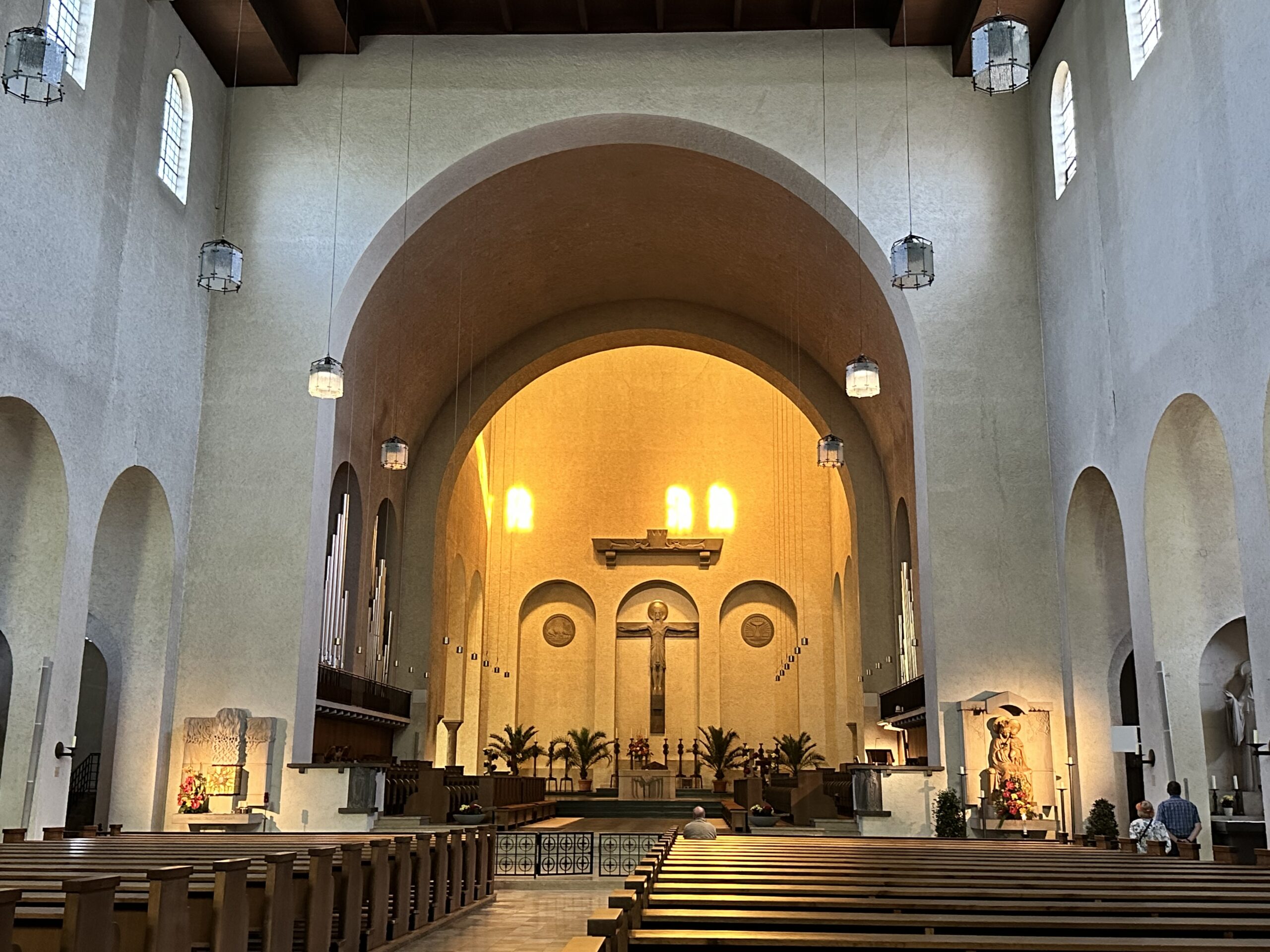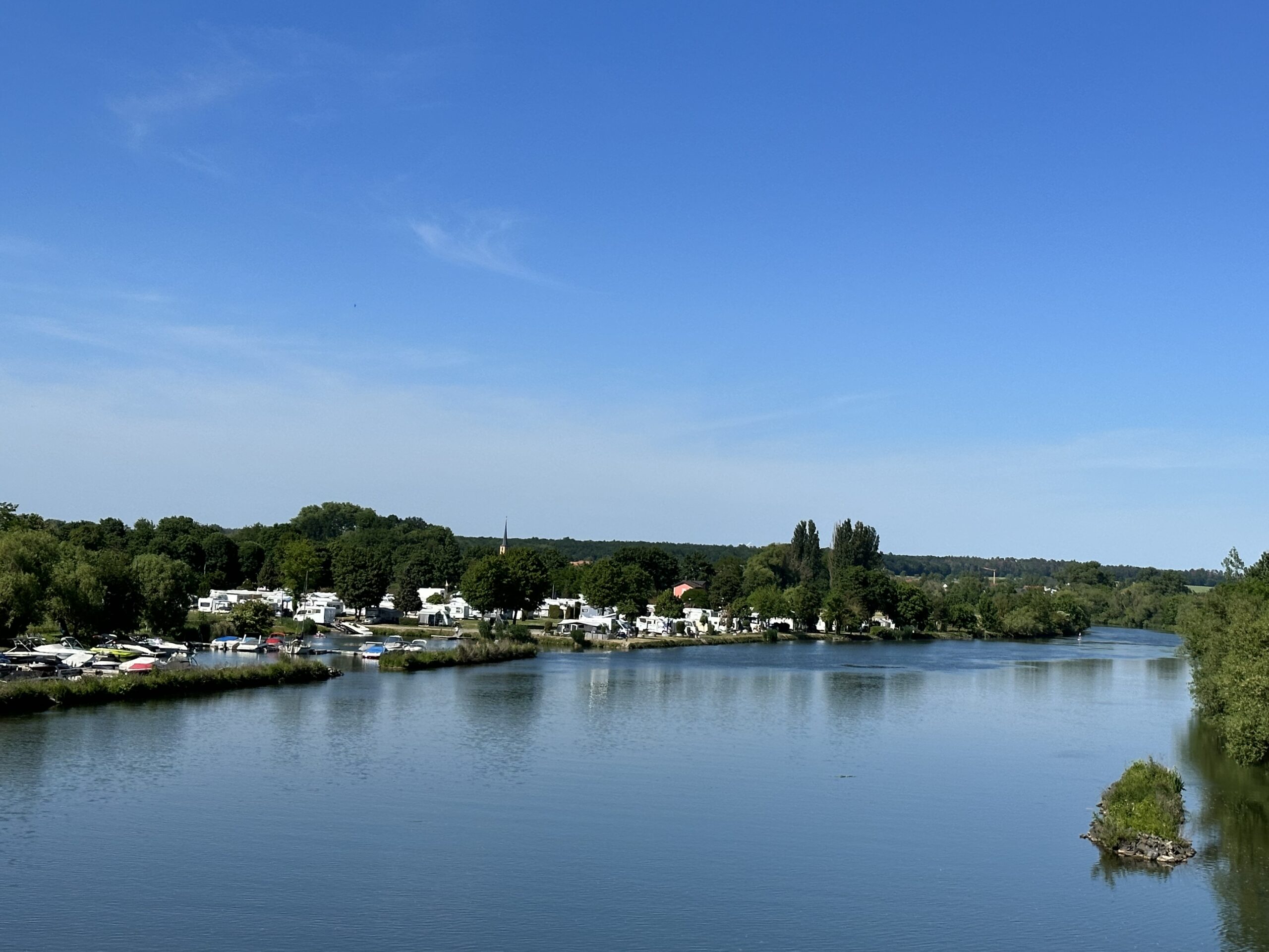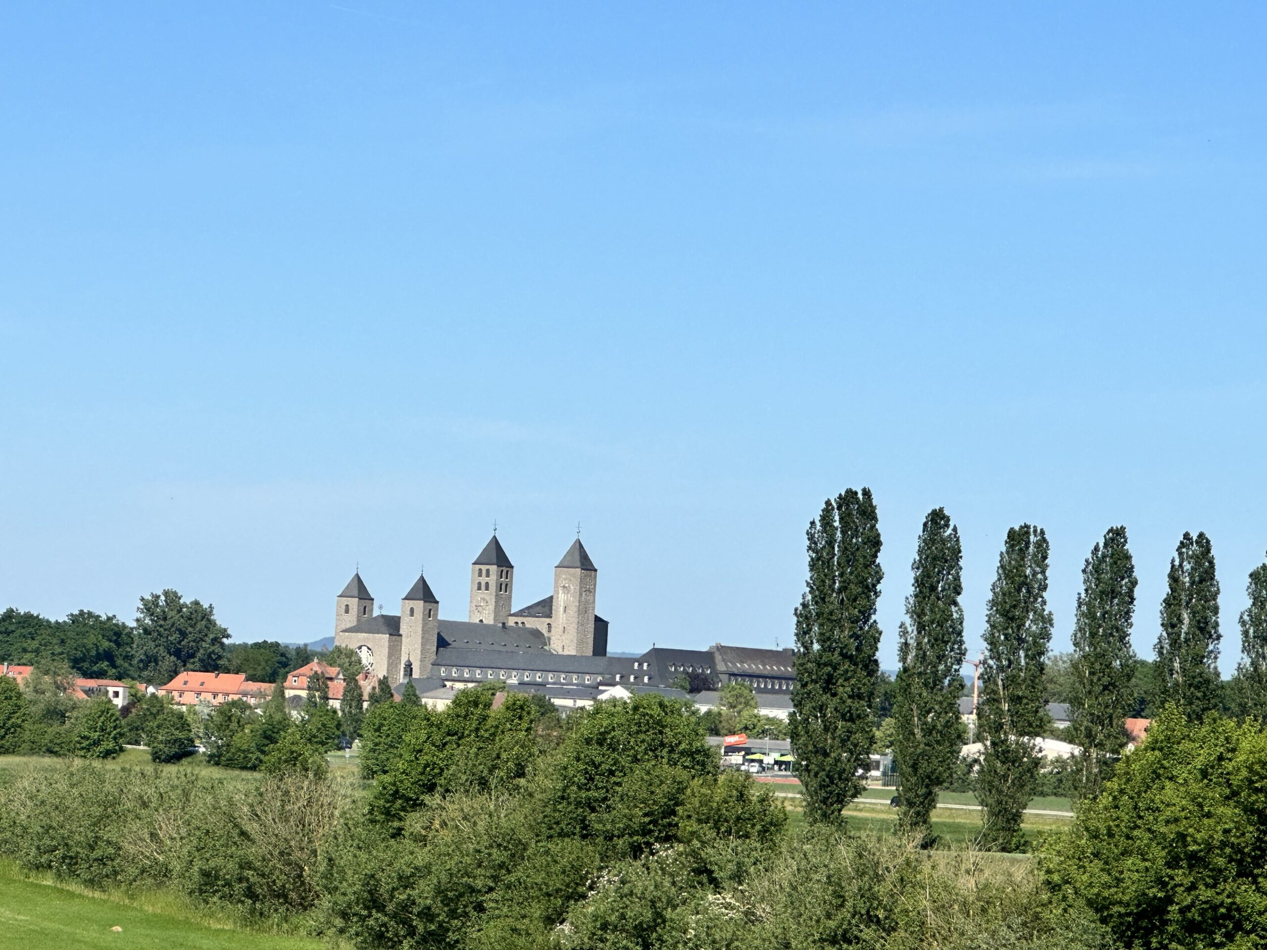Wir haben einen Platz in der ersten Reihe am Main (A1) gebucht – toll! Nur wenige Binnenschiffe ziehen vorbei, man wundert sich mitunter vielleicht doch über deren Länge, ein Schubverband hatte leicht 200 m. Auf dem Platz ist recht wenig los, auch Dauercamper sind nur einige da. Sanitär ist OK, teilweise neu. Der Platz liegt im Ortsteil Schwarzenau der Stadt Schwarzach, die gegenüber liegt. Gleichfalls gegenüber Münsterschwarzach mit einem großen Benediktinerkloster und einer großen Kirche (u.a. vier Türme) im neoromanischen Stil. Es ist wohl die vierte Kirche an gleicher Stelle, sie wurde in den 1930er Jahren erbaut. Anselm Grün lebt hier, Dieter Henkel war wohl mehrfach für ein paar Tage da. Es gibt auch eine Klosterbäckerei und eine Metzgerei, wo wir einige leckere Sachen einkaufen bei unserem zweiten Besuch. In der Klosterbücherei kaufen wir dann auch noch ein.